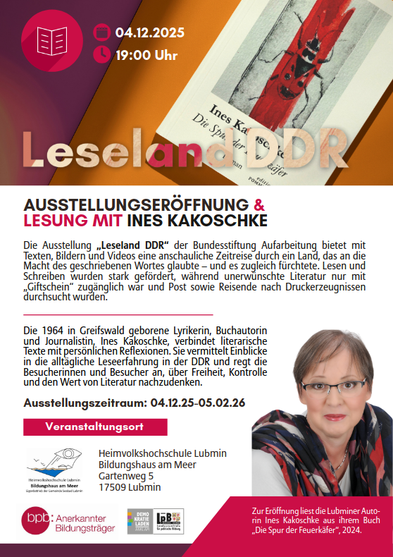Vom 04.12.2025 bis zum 05.02.2026 präsentiert das Lubminer Bildungshaus am Meer seinen Gästen eine Ausstellung der Bundesstiftung Aufarbeitung zum Thema „Leseland DDR“.